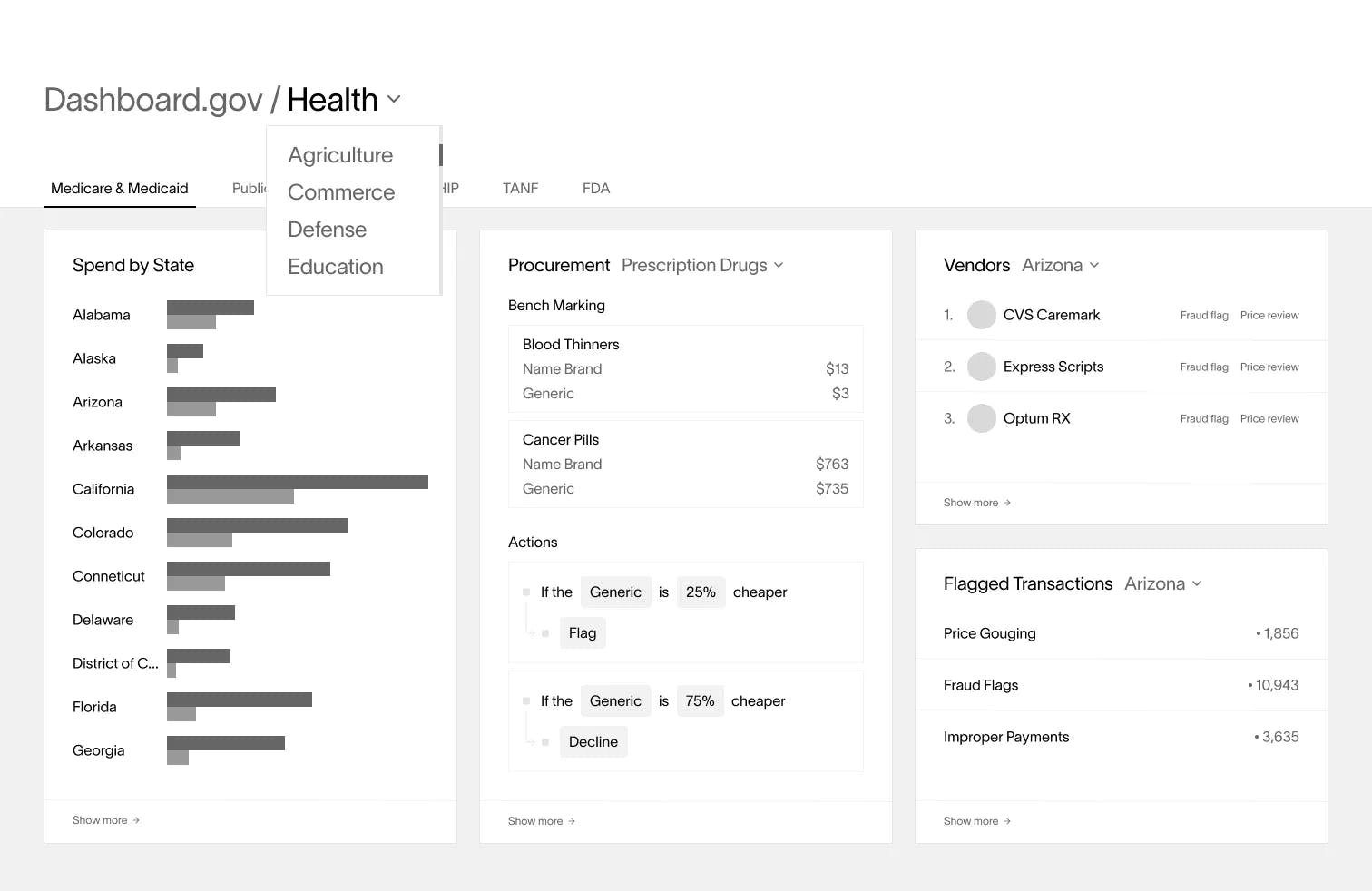 Private market operators drive the majority of their business through data dashboards that can be customized in real time across all their transactions. Imagine a world where every department of the US government had the same real-time visibility at dashboard.gov. Just hit the right URL: dashboard.gov/defense or dashboard.gov/agriculture.