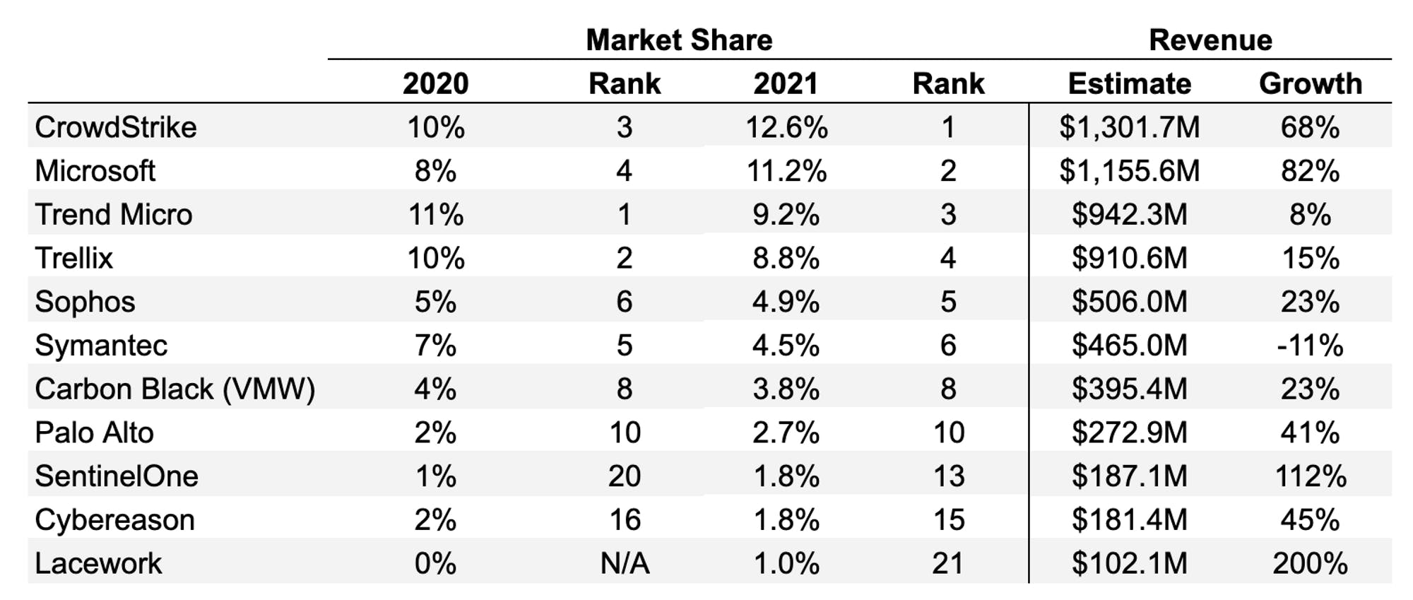 The market opportunity for endpoint security is currently the largest within cybersecurity. Estimates from CrowdStrike, SentinelOne, and Fortinet peg the market size at around $25-30 billion in 2022 expanding to $40 billion in 2024. According to the IDC, the worldwide corporate market for endpoint security grew 14% in 2020 and 29% in 2021. In addition, combined revenue from key endpoint protection companies grew from $7 billion in 2019 to $10 billion in 2021. The key endpoint companies, by market share, include the likes of CrowdStrike, McAfee, and Microsoft.