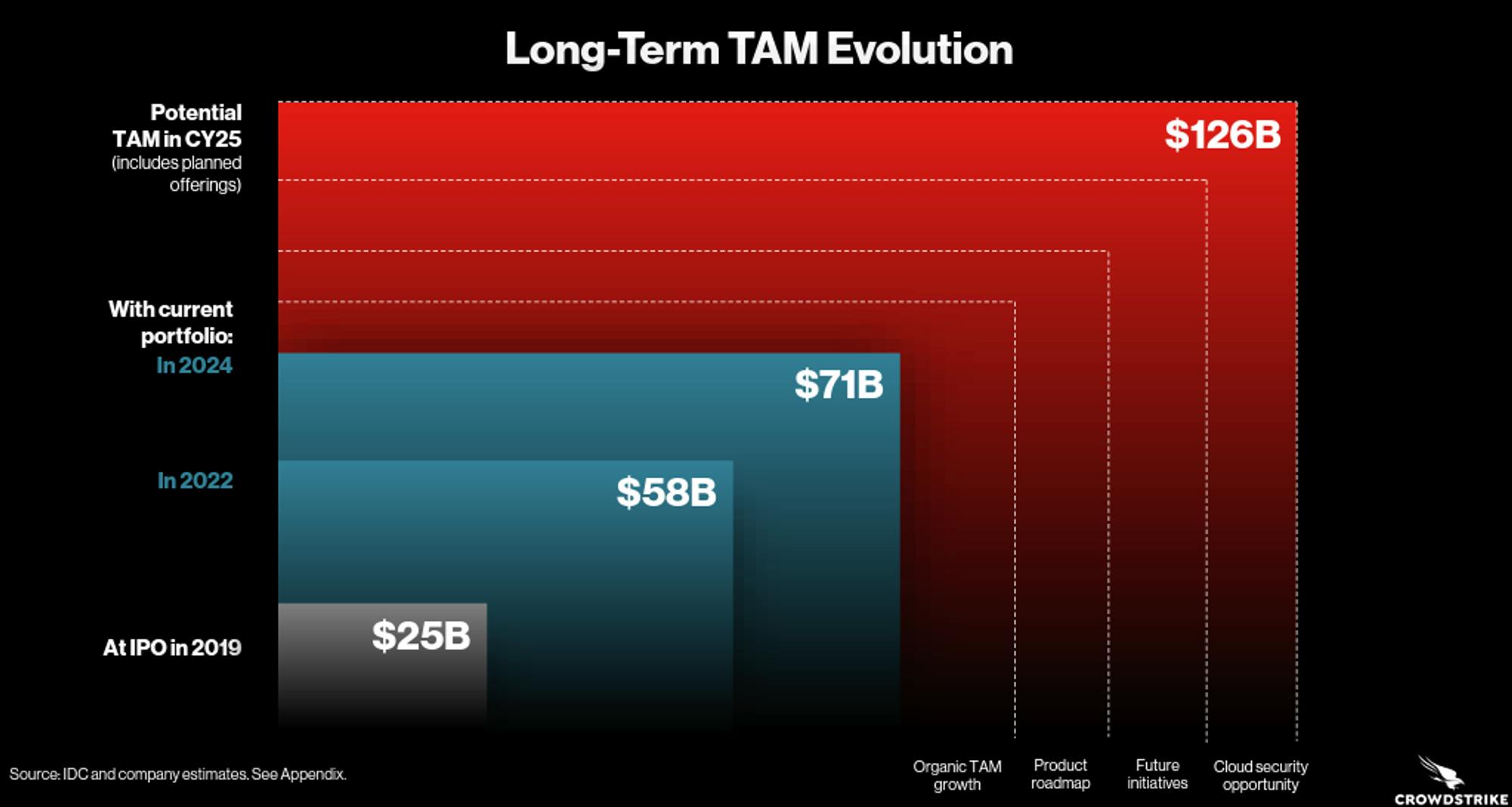 The market opportunity is large and fragmented: The largest companies within cybersecurity all provide endpoint security as a core business line. The $30 billion endpoint security market represents the largest market opportunity within security, which grew by over 29% in 2021. Over the next 5-years, IDC and CrowdStrike believe the industry can reach an almost $126 billion TAM due to the expanding number of devices and workloads moving to the cloud.