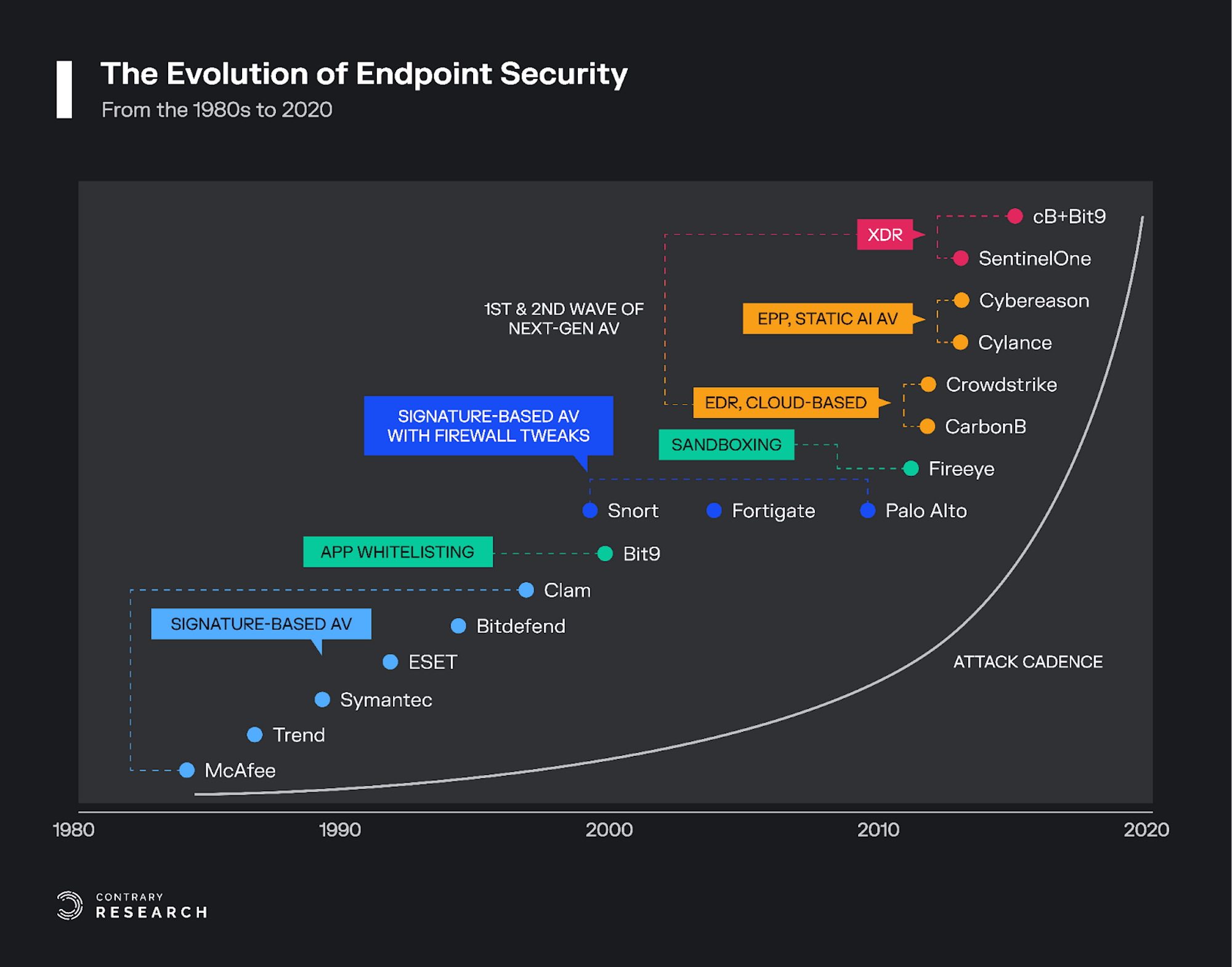 Over time, endpoint security technology has evolved from legacy signature-based antivirus into endpoint detection, and eventually became unified as XDR. As a result of how quickly the technology continues to improve, large incumbents like Trend Micro and McAfee have been increasingly unseated, and emerging players like CrowdStrike and SentinelOne are quickly capturing market share from these leading players. This has led to the creation of adjacent markets like cloud workload protection, and Industrial IoT for the endpoint protection industry. Companies that can keep pace with the technology, and how hackers continue to change their tactics, will emerge to be long-term winners in this market.