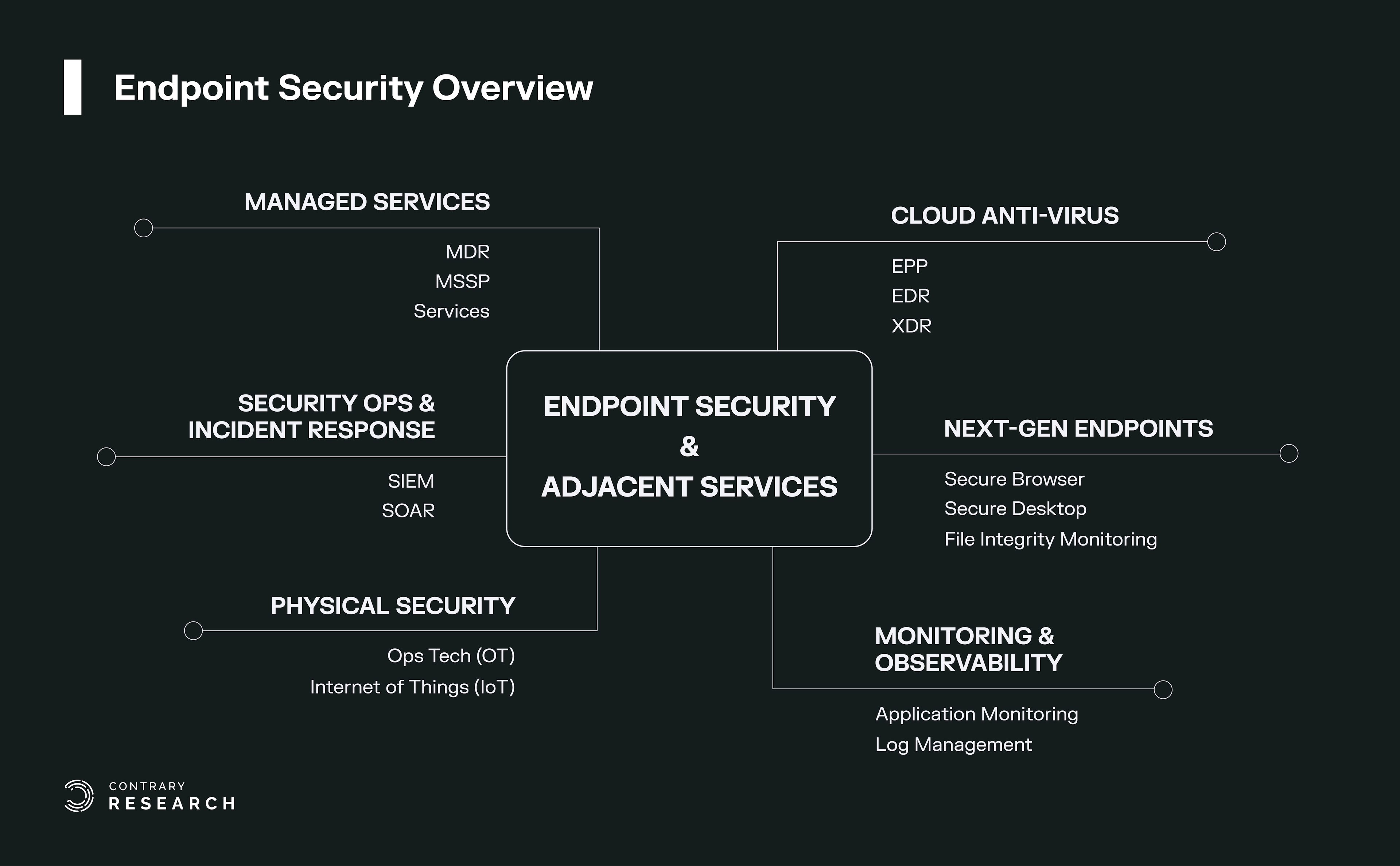 Endpoint security has seen the emergence of multiple adjacent industries that have emanated from protecting the enterprise. This report explores Managed Detection and Response (MDR), Managed Security Service Providers (MSSP), Security Information and Event Management (SIEM), and Security Operations (SecOps). Dominant companies and high-potential startups within each of these sectors are highlighted. Lastly, the report concludes with a discussion about the convergence and future evolution of the endpoint security industry. This convergence is most pronounced within emerging categories like Extended Detection and Response (XDR) and Cloud Workload Protection Platforms (CWPP).