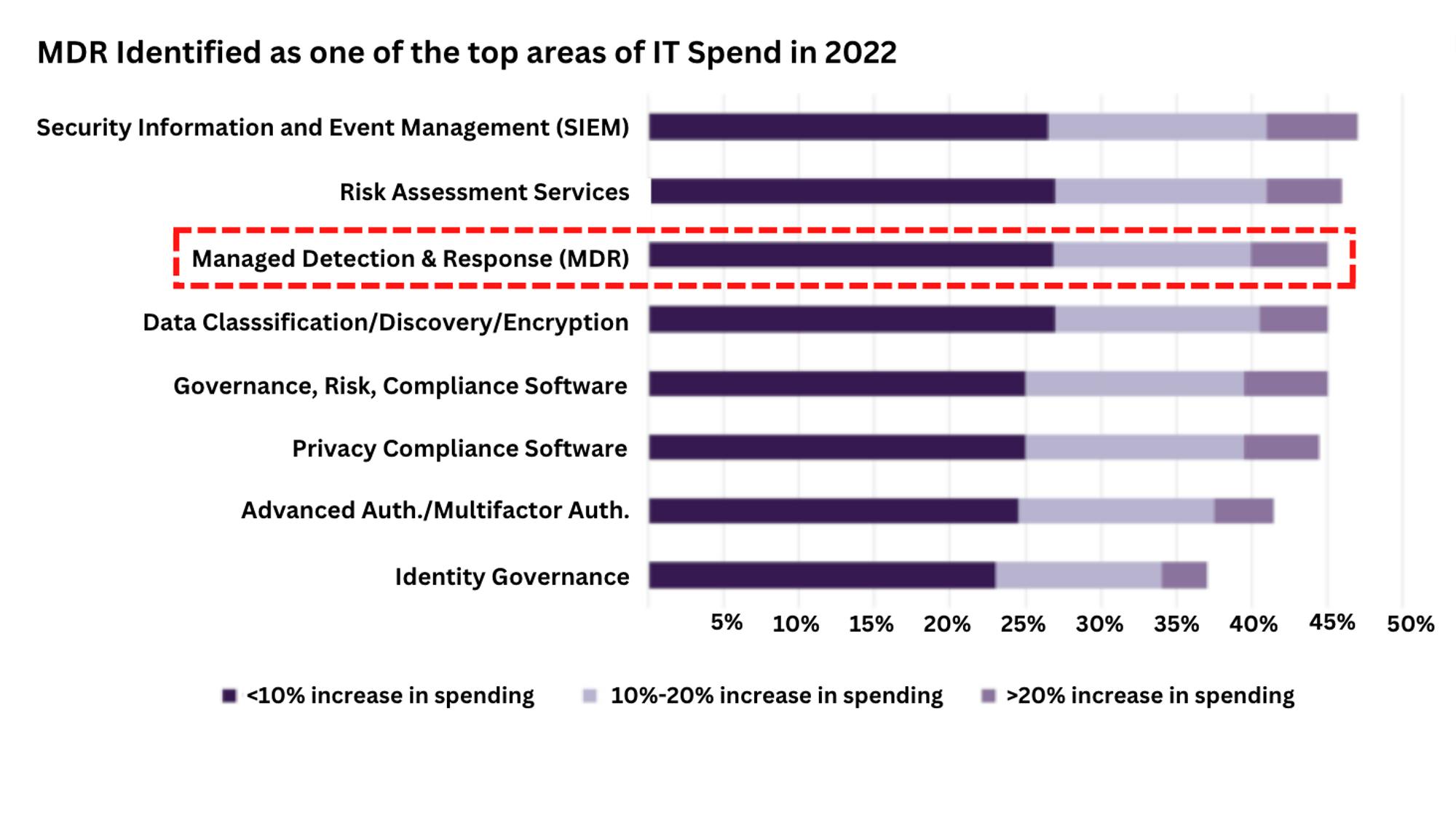 For example, In CrowdStrike’s FYQ1 ‘23 quarterly earnings call, CrowdStrike mentioned that its MDR business was showing the strongest growth amongst all its modules. The CEO was quoted as saying that “customers want to complement their EDR solutions with an MDR component that provides them with advice.” According to the 2022 IDC Survey report, CTOs were asked “How will your organization's planned spending [budget] on the following IT services change for 2022?” and approximately 45% of companies intended to spend more on MDRs in 2022 compared to 2021.