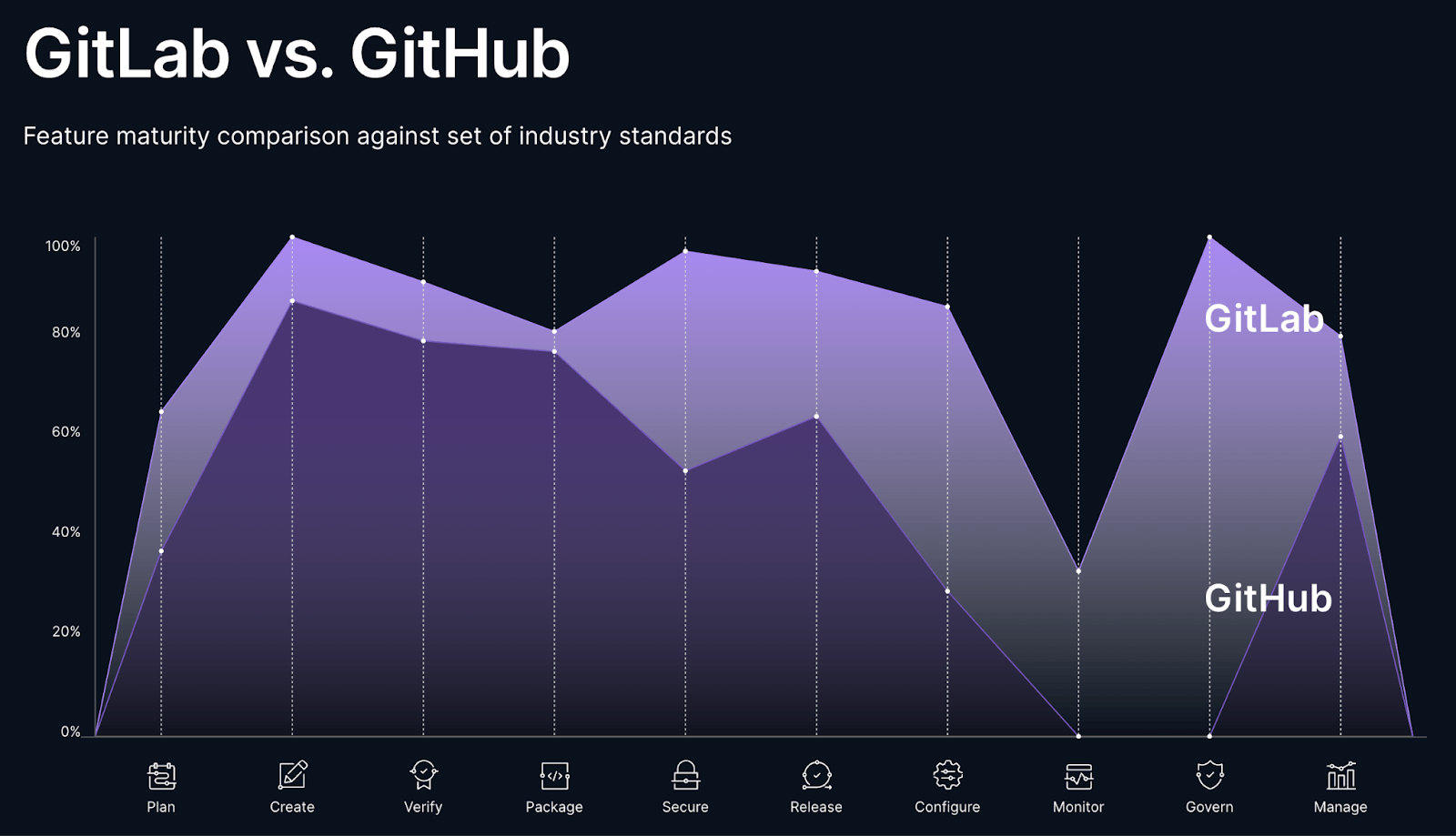 The core difference between GitHub and GitLab is that GitHub focuses on code repository and enables users to easily integrate with CI/CD tools of their choice (e.g. Jenkins, CircleCI). GitLab includes not only their own CI/CD, but also an entire suite of DevOps tooling in one platform so that, if a user chooses, there's no need for other third party tools. GitLab is also very public about their product features, road map, and comparability to other tools. GitLab even published an analysis of their feature maturity against industry standards for GitHub and GitLab. GitLab ranked 82% complete compared to GitHub at 56%.