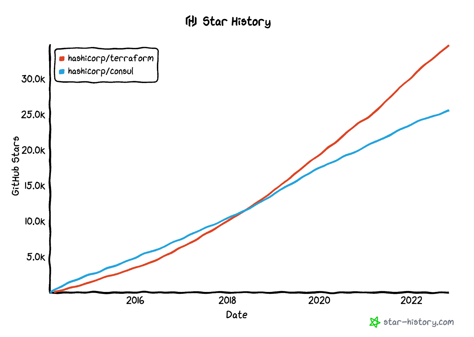 HashiCorp’s open-source approach has enabled it to foster a deep connection with the developer community which supports their primary GTM strategy of building relationships with DevOps decision-makers rather than a high-touch top-down approach of courting the attention of executives. You can see a hint of the response from the developer community from the growth in stars (similar to a “like”) on GitHub for some of their more popular products.