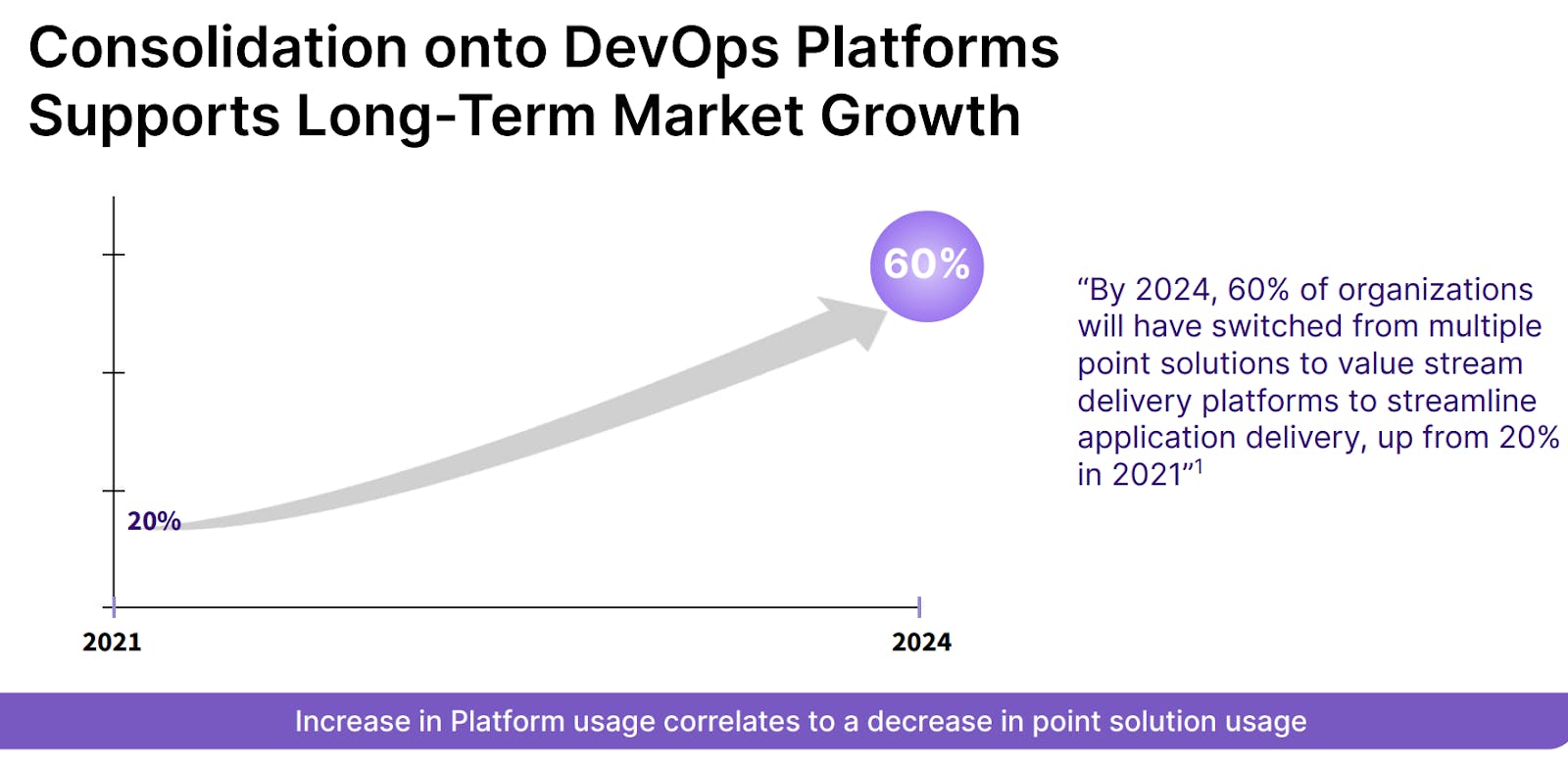 The opportunity now is for companies to provide the products that will accelerate the adoption of DevOps across organizations of all sizes. The DevOps market is expected to grow to $26 billion by 2027, up from $7 billion in 2021. As the market grows, so does the complexity of managing a variety of individual solutions. Gartner estimates that by 2024, 60% of organizations will have switched from multiple-point solutions to value stream management platforms to streamline application delivery, up from 20% in 2021.