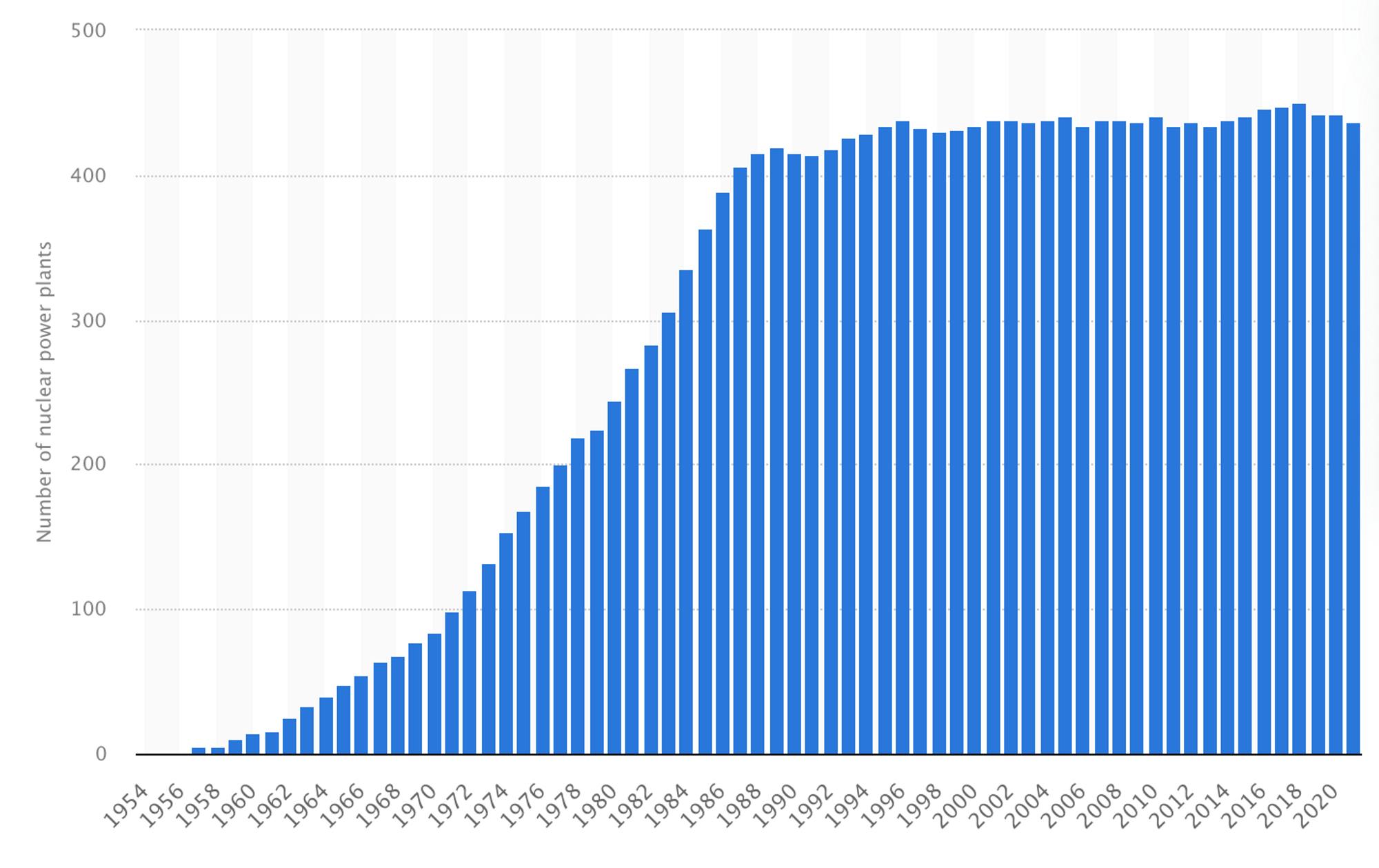 Nuclear energy has had a controversial history relative to other renewable sources of energy. After disasters like Three Mile Island in 1979 and Chernobyl in 1986, ~50% of people opposed the use of nuclear energy. That opposition put a stop to the expansion of new nuclear facilities, which had nearly doubled from 1978 to 1988. Since then, the number of facilities globally has plateaued.