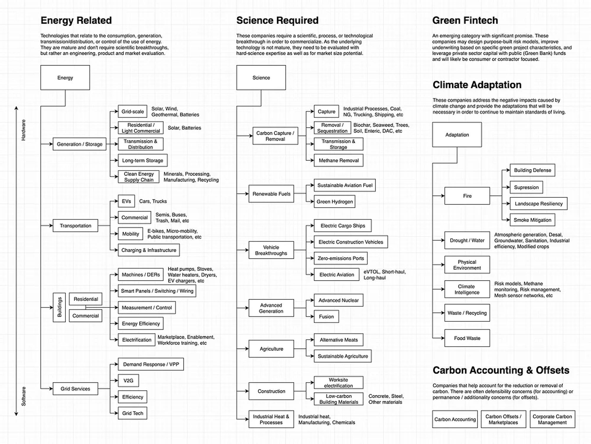 These high-level categories can be broken down further into sub-categories like energy generation, battery and energy storage, carbon management, precision agriculture, and more. In our Living Landscape: Climate Tech, we break down these categories and the relevant businesses tackling each of them.