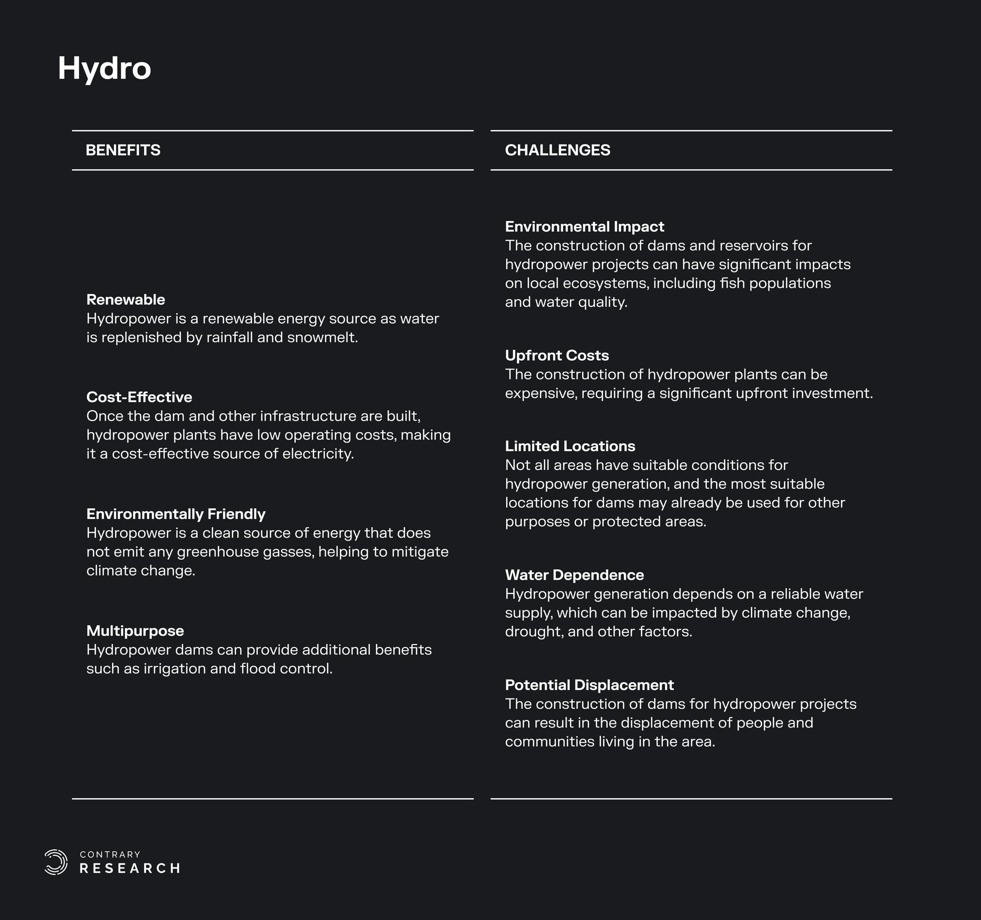 However, similar to solar and wind, there are also some downsides and limitations with hydropower. There are very few locations on earth that can support a sizable dam to generate hydropower. In addition, dams change the flows of water and dramatically impact areas where people are living. Summarized below are some of the key benefits and challenges that apply to hydropower.