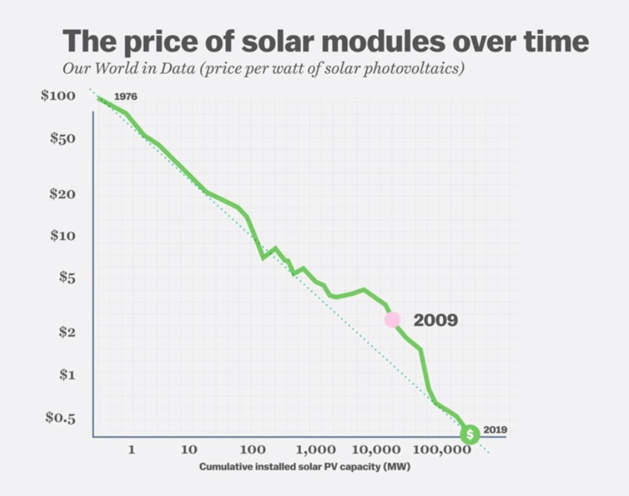 Beyond incentives, the fundamental cost of manufacturing solar systems has also continued to come down. Between 2009 and 2019, the cost of a solar module dropped by 90% as countries like the US in the 1970s, Japan and Germany in the 1980s and 1990s, and China in the 2000s incentivized investments in renewable energy manufacturing.