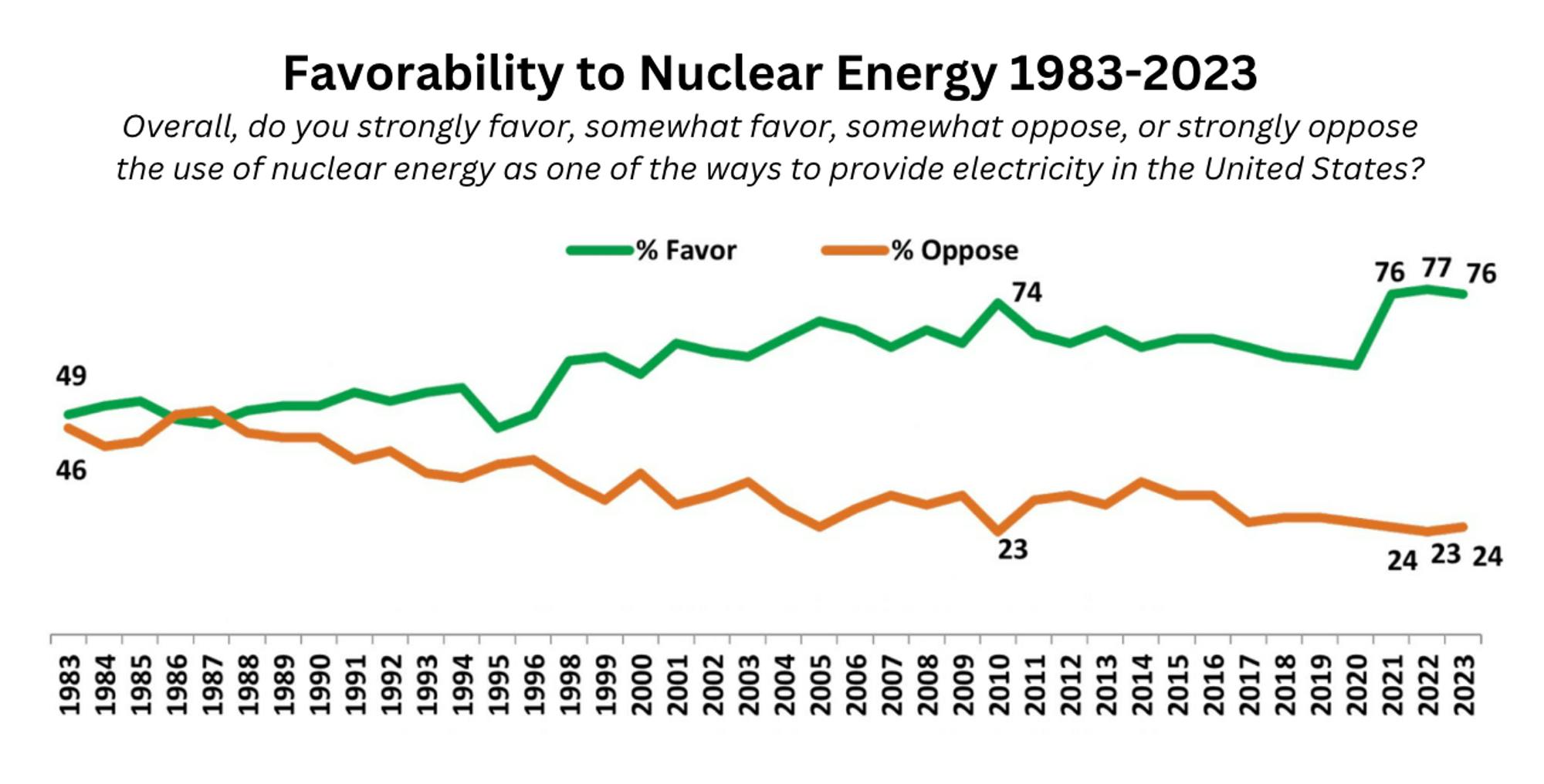 However, despite additional incidents like Fukushima in 2011, public sentiment around nuclear energy has been steadily improving. Whereas before, in the 1980s, 50% of the US had been opposed to using nuclear energy, as of June 2023, 86% believed nuclear energy will be important in meeting electricity needs in the US in the coming years, and 71% said the US should “definitely” build more nuclear plants.