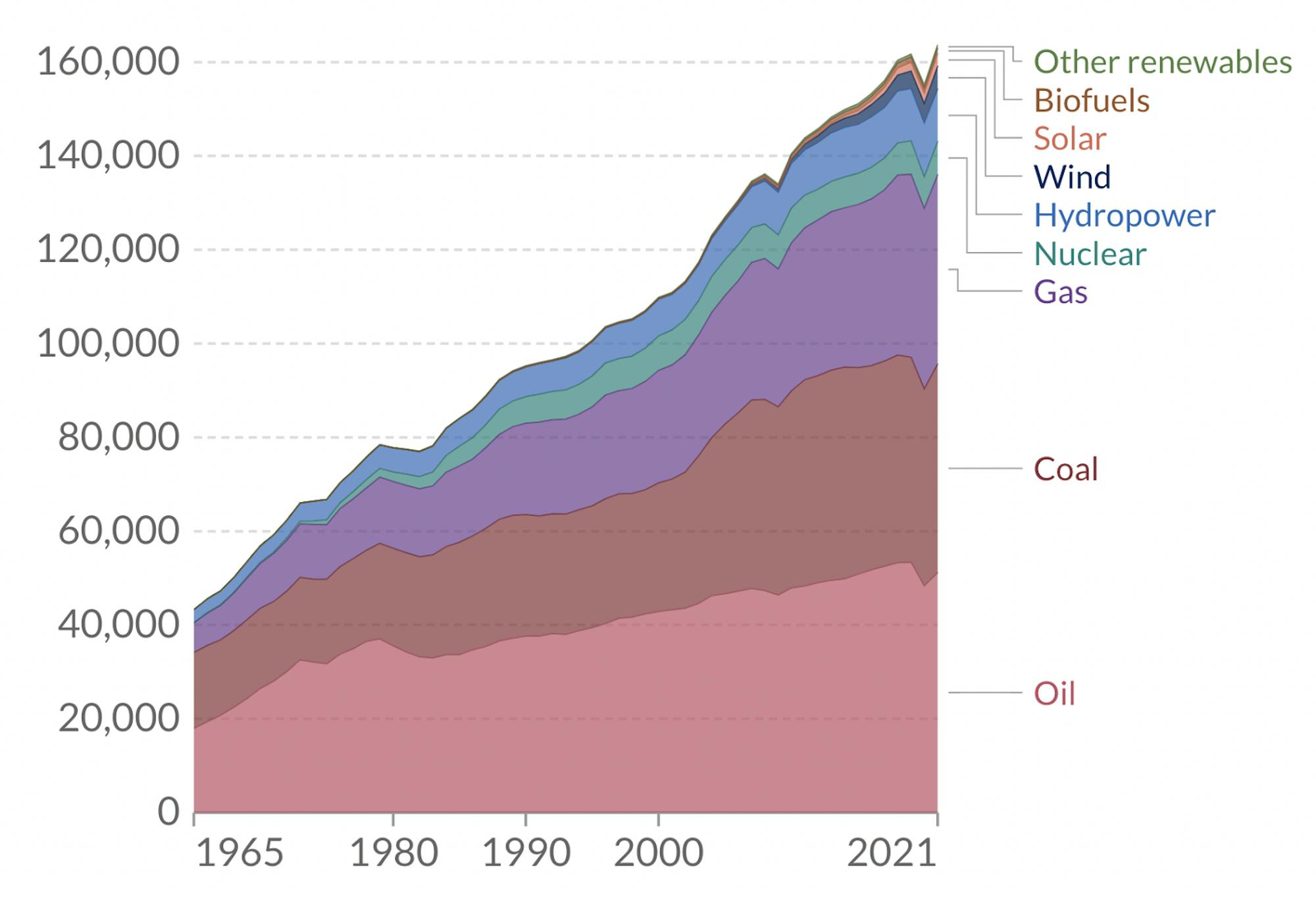 In 2022, fossil fuels still accounted for roughly 80% of the production of global energy. Solar, wind, hydro, and nuclear were responsible for the majority of the remaining production.