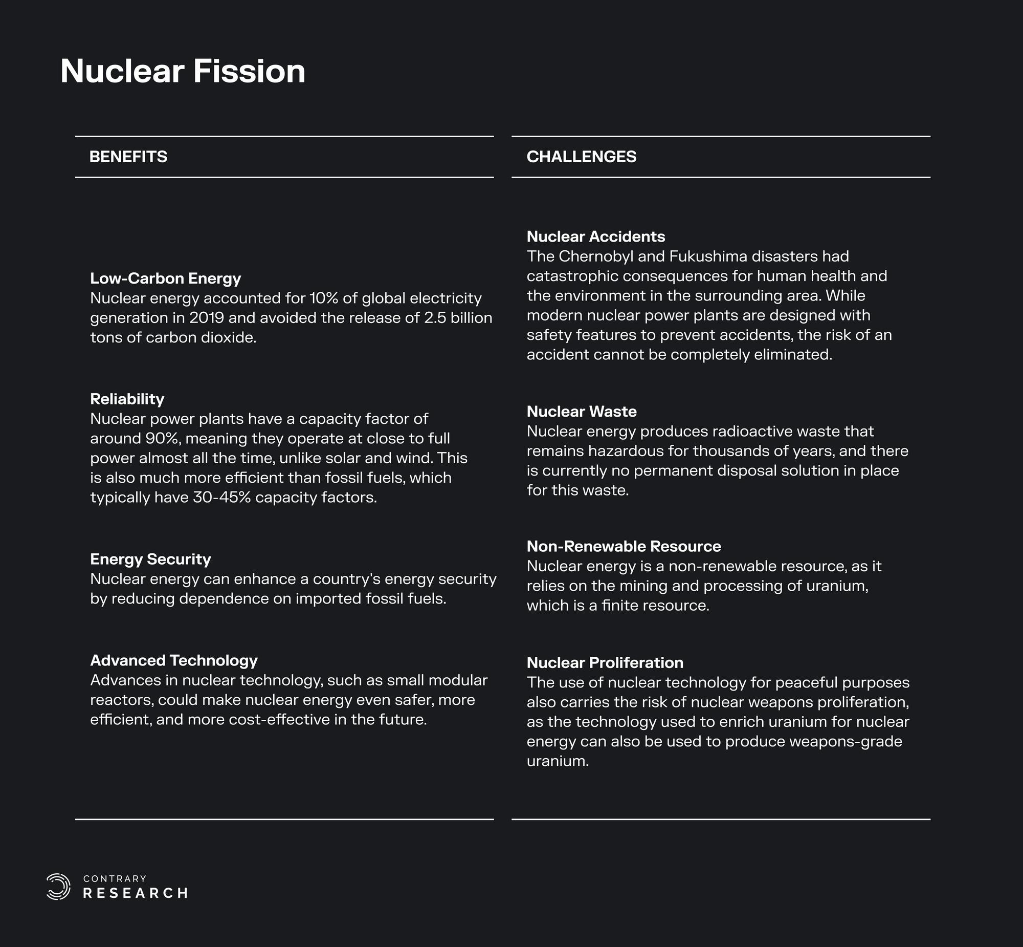 Below are some of the key benefits and challenges that apply to nuclear fission:
