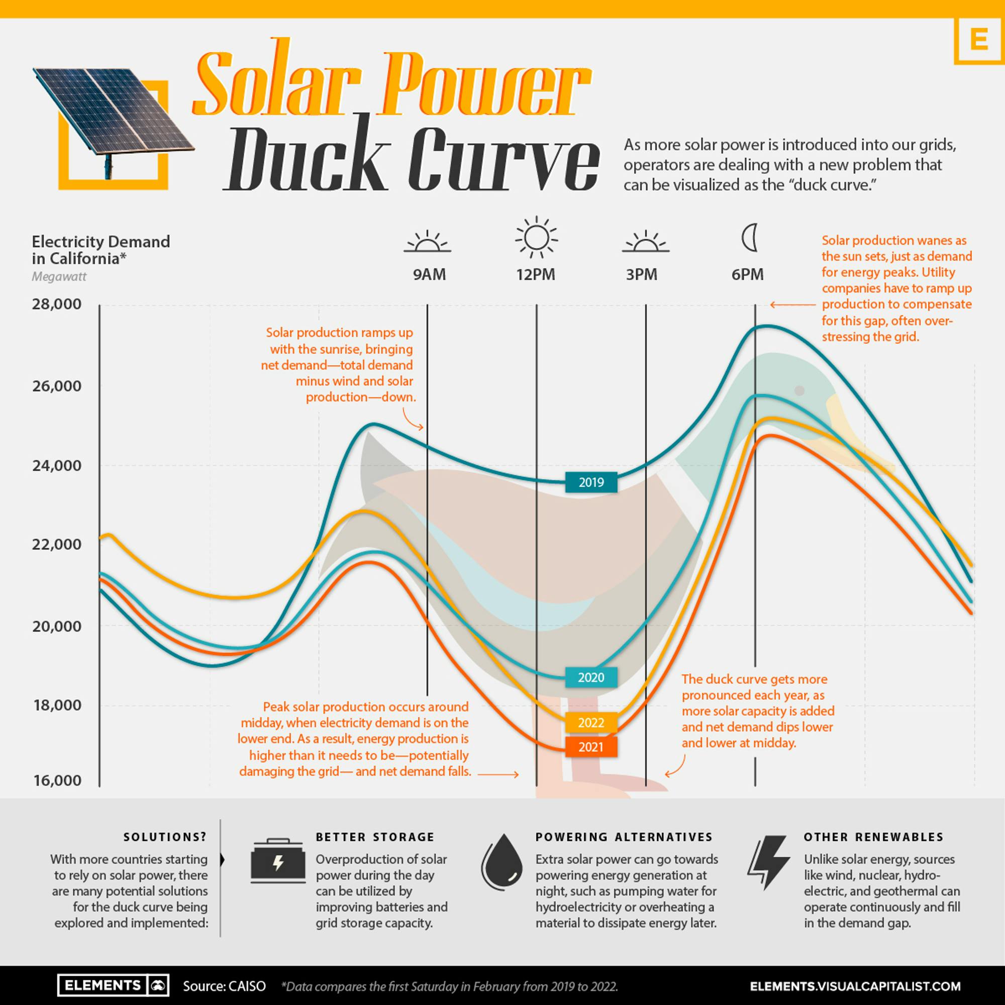 Energy demand begins to surge typically at the same time of day as the sun goes down and wind speeds decline. As a result, utilities are forced to quickly ramp up fossil fuel combustion plants to fulfill net new energy demand as renewable energy availability declines. Until battery and energy storage technology allows us to more effectively store the excess energy during the day or spread it out to lighten the evening load, the amount of solar and wind energy that will be usable in the electric grid will be capped.