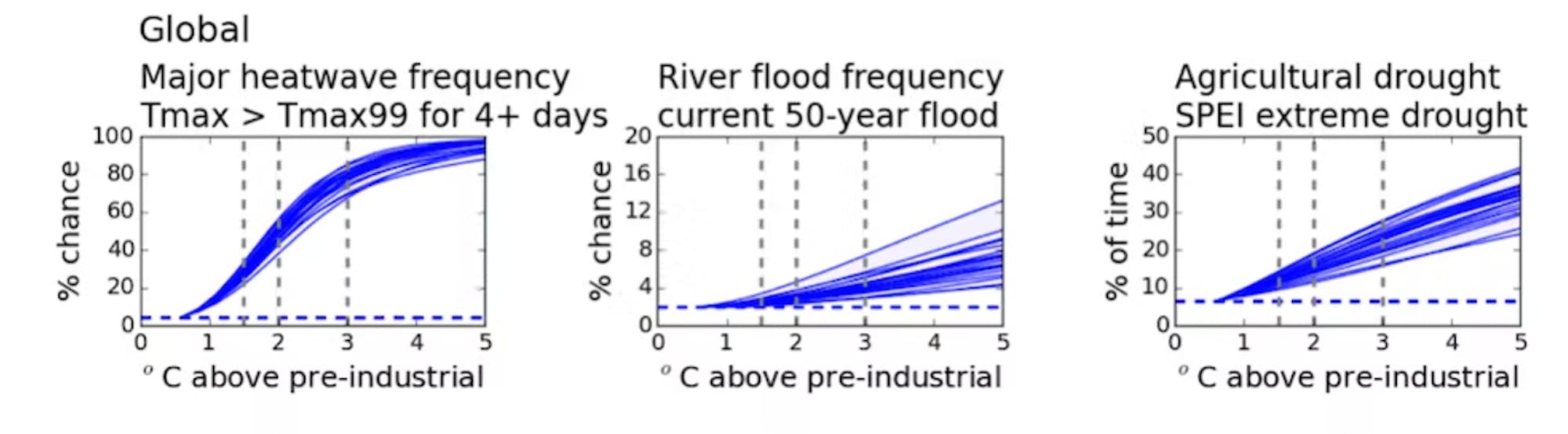 One study estimated that the frequency of a major heat wave would increase by 92% at above 4° C pre-industrial levels. In addition, the melting of the polar ice caps means that more water has been activated into the weather system and therefore, when that water evaporates, more water is held in the clouds and therefore, there is more rainfall.