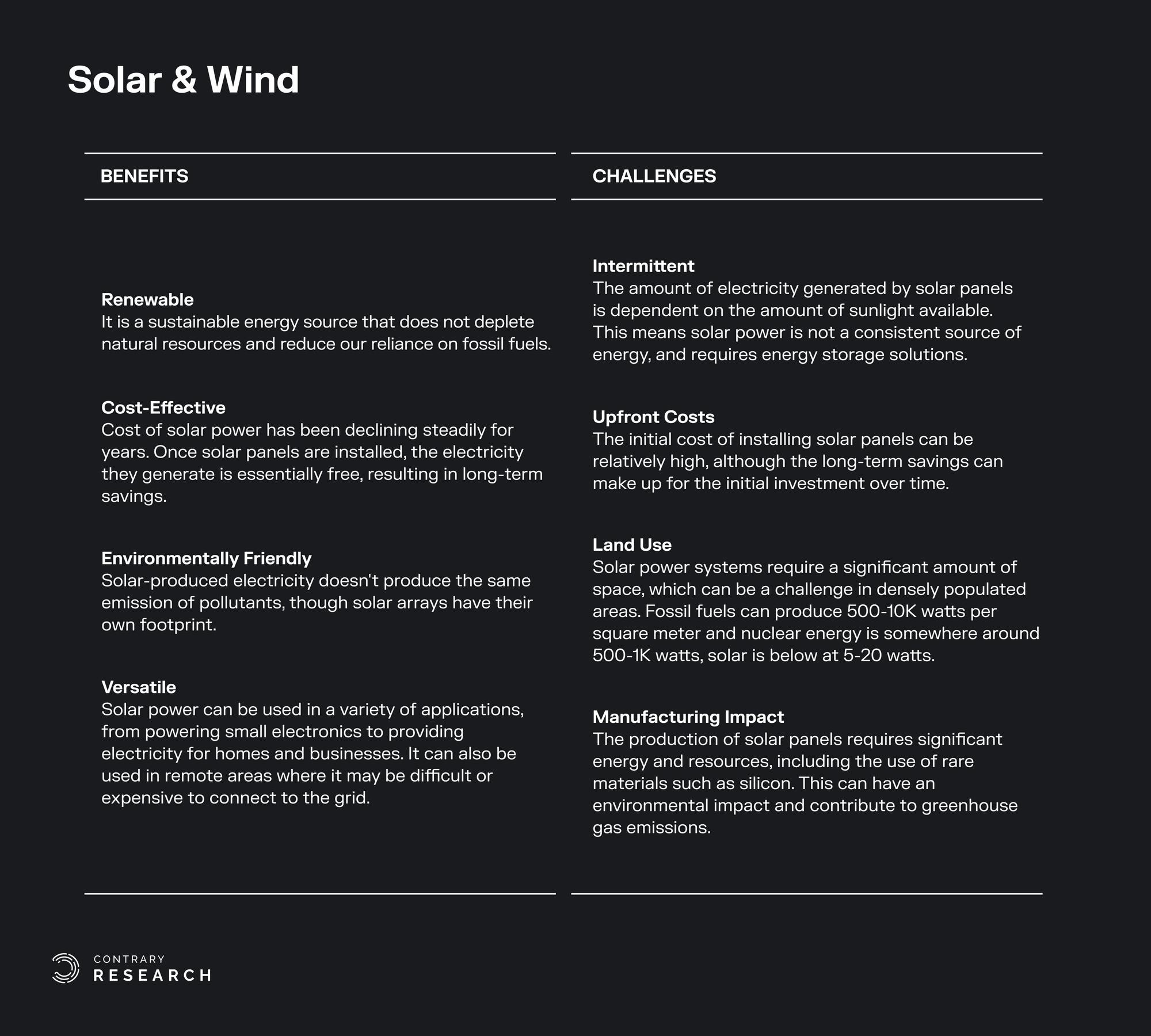 In addition to continuing to improve the solar supply chain, there are other limitations for both solar and wind. Some of the key benefits and challenges of solar and wind power are summarized below.