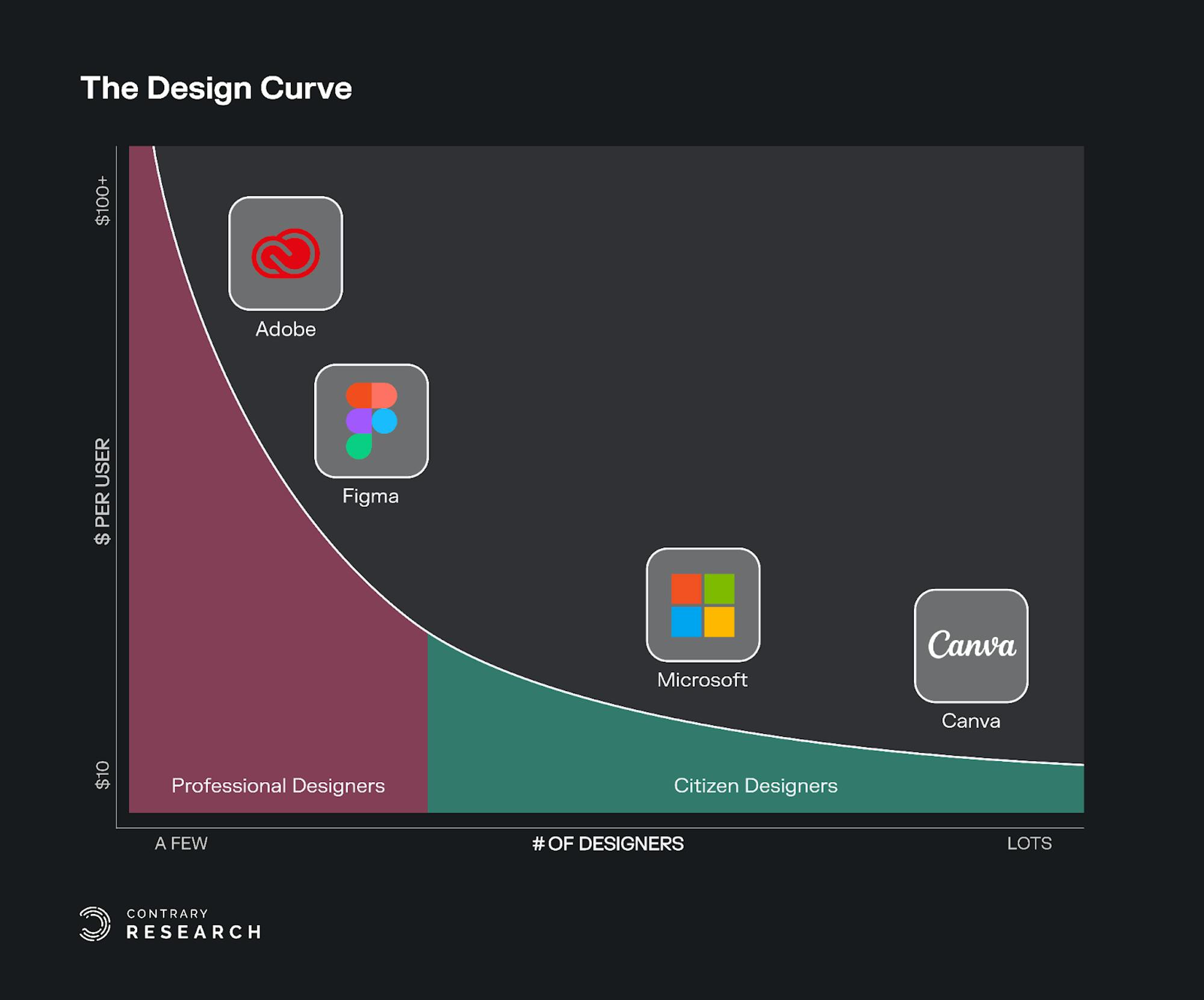 When you compare the surface area between Figma and Canva, you see a very different dynamic. Canva has reached over $1 billion in ARR across 75 million active users. Figma has ~$400 million in ARR and 4 million active users. That represents an average of $100 in value per user for Figma compared to Canva’s $13 per user. Where Figma has maximized the value from professional users, Canva has been built on the value of the long tail of citizen designers.