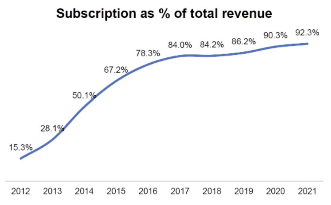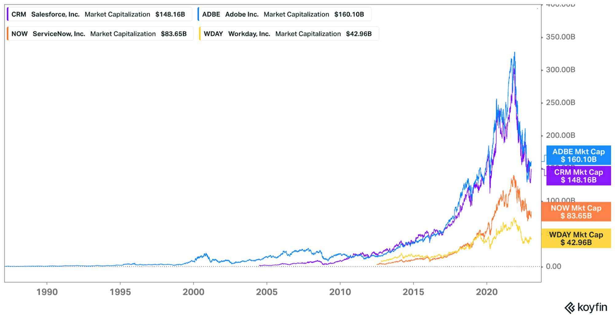 By 2012, Adobe took a turn when they pivoted to a subscription bundle with the launch of the Adobe Creative Cloud. The company’s stock began to rise unlike ever before, peaking at a $317 billion market cap in 2021 before dropping to ~$160 billion as of January 2023, along with most SaaS companies that experienced a 2022 valuation correction. That transition has also enabled Adobe to increase their growth rate from ~7% annually in the early 2000s to 20-30% in the 5 years after 2015.