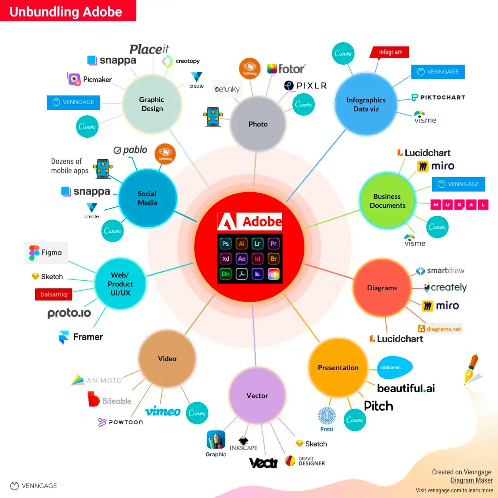 Adobe’s success at bundling its products has also invited unbundling as users' preferences for their digital tools have evolved. Different companies have emerged to attempt to carve out aspects of Adobe’s product suite and offer them as standalone products. Adobe has simultaneously been fighting to better bundle its products while also fighting off a number of threats to make its products less relevant.