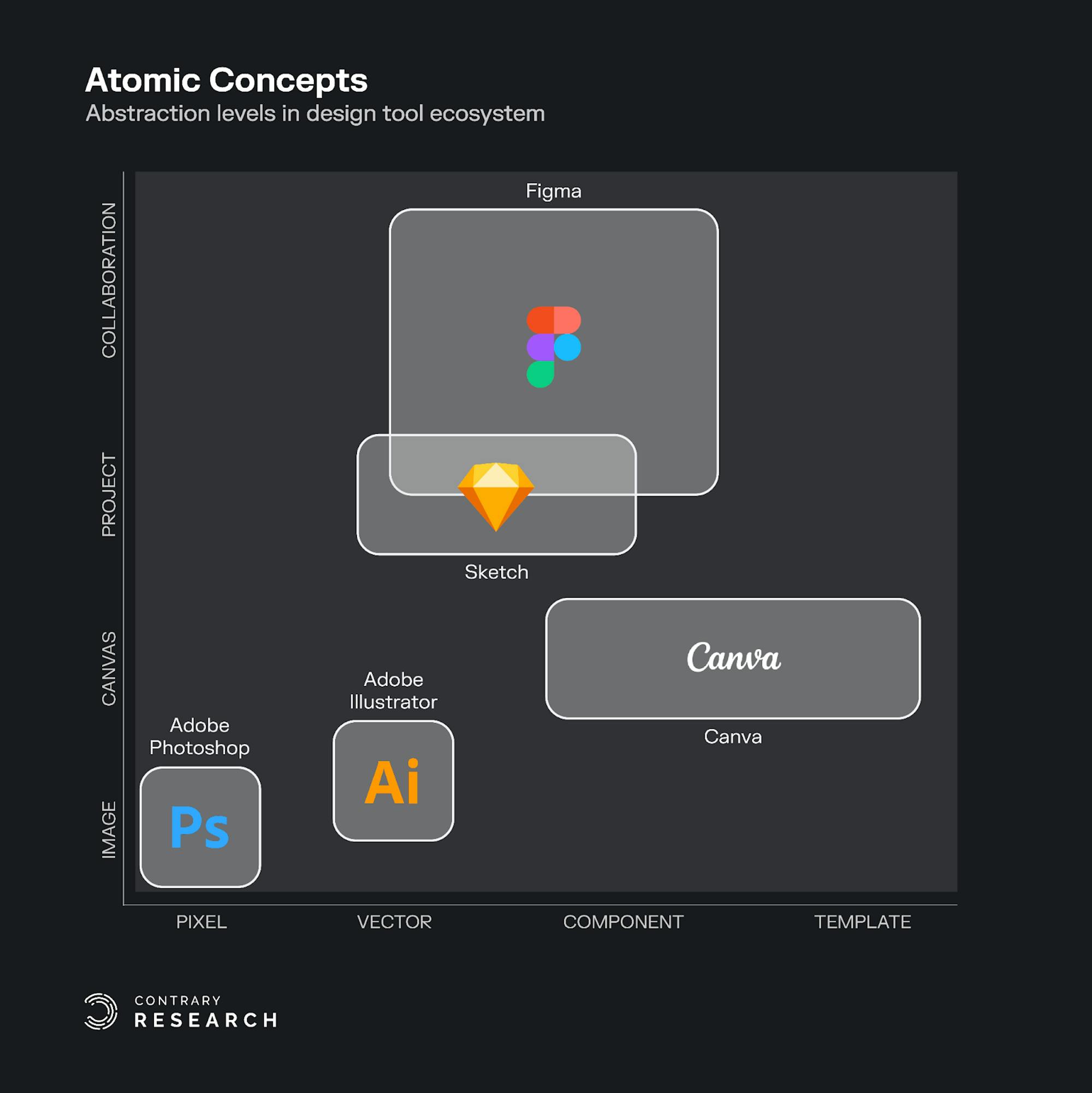 There are two meaningful drivers behind how these different design tools have oriented themselves. The first is Kevin Kwok’s idea of “atomic concepts” that each product revolves around. These are specific “primitives” that a more specialized design product attempts to emphasize in what aspects of design they own.