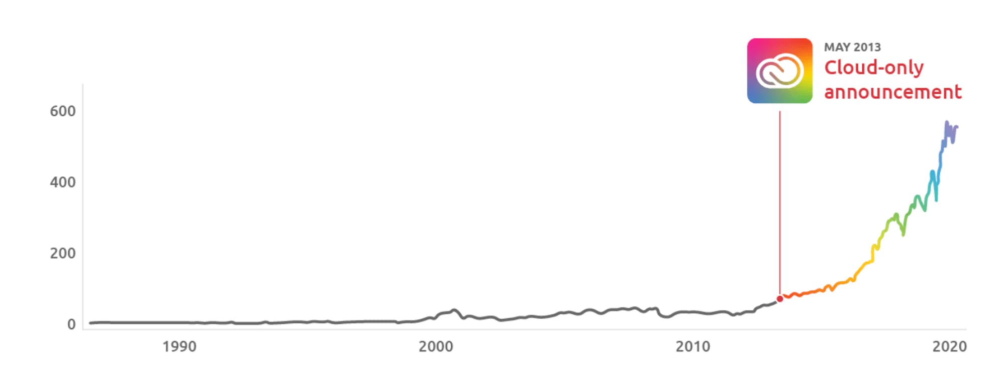 After launching products in the 1990s that remain household names into the 2020s, Adobe largely stagnated during the early 2000s. In 2007, Shantanu Narayen became CEO and is still leading the company as of January 2023. One of Shantanu’s biggest accomplishments was transitioning the business to a subscription model.