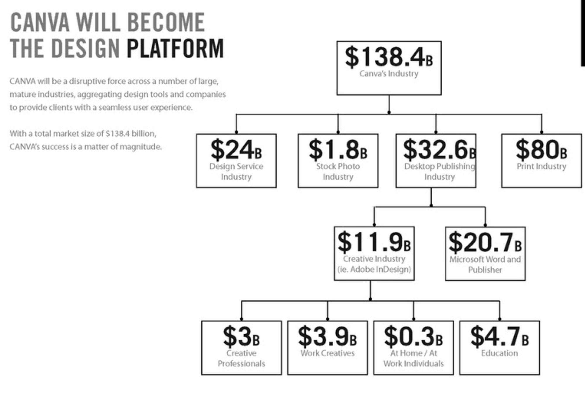From early on, Canva outlined its market as addressing every aspect of the world of design. Canva’s vision was “taking on the entire world of design… beating Microsoft Office and Adobe and Google Docs and a bunch of other companies.” In Canva’s first pitch deck, Melanie Perkins projected their addressable market to be nearly universal across all categories of design: