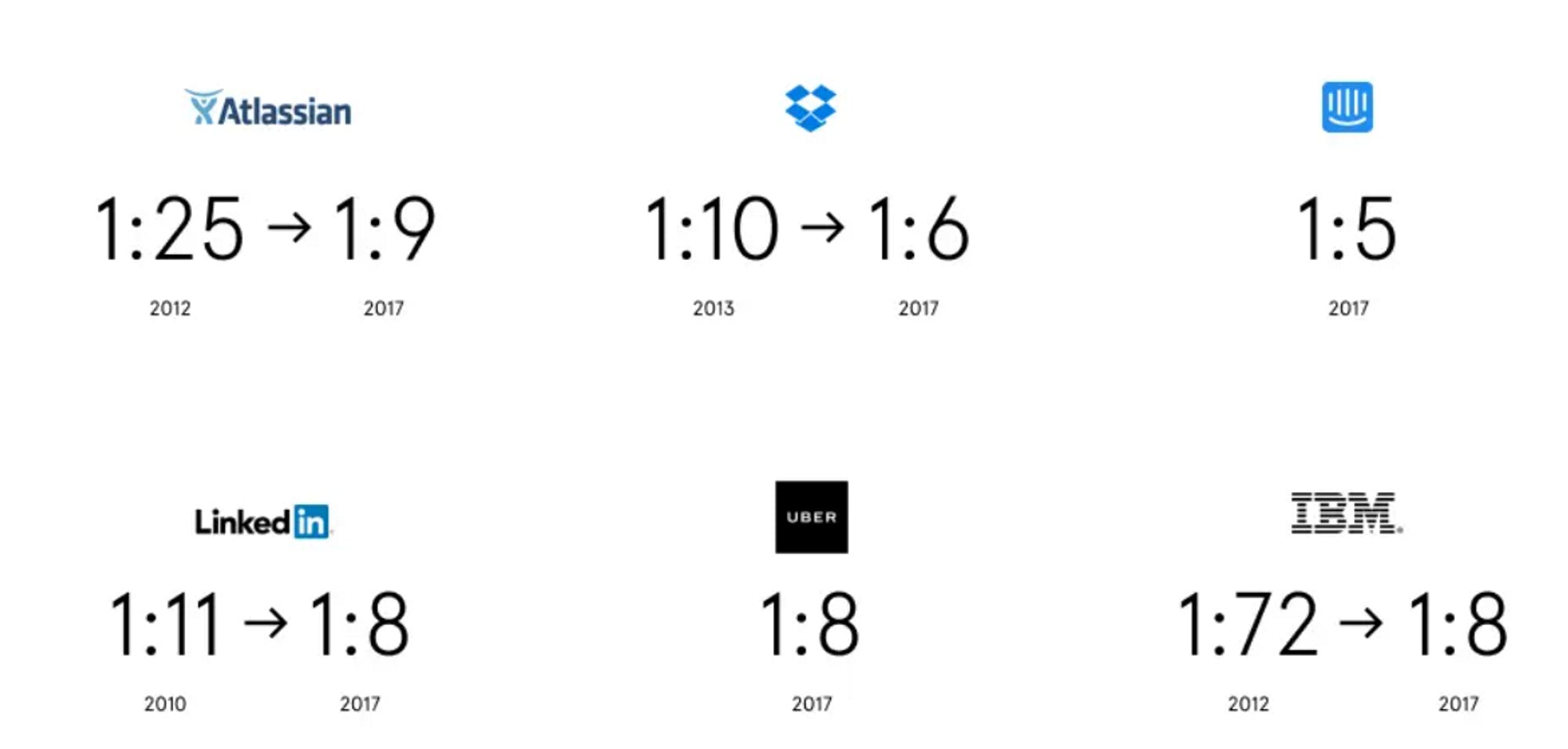 In 2019, Figma famously pointed to this trend as one key driver of their success. At this point, it wasn’t just consumer products and websites that had embraced the criticality of design. Enterprises also began to recognize that they were increasingly reliant on high-quality design to drive product differentiation. As a result, the ratio of engineers to designers working in enterprise teams grew more balanced, as enterprises like IBM or Atlassian increased the number of designers on their teams.