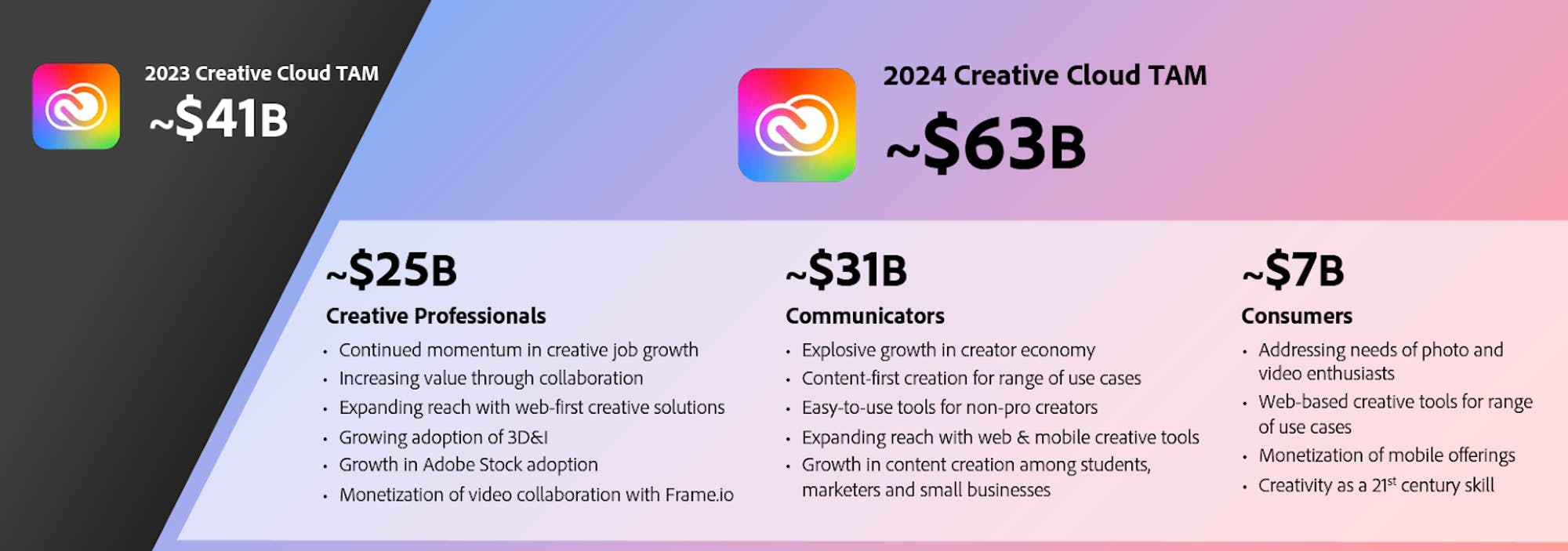 Adobe estimates the market for professional designers at ~$25B across 68 million creatives. Figma has already demonstrated that their addressable market expands beyond just the designers, with two-thirds of their user base coming from non-designers.