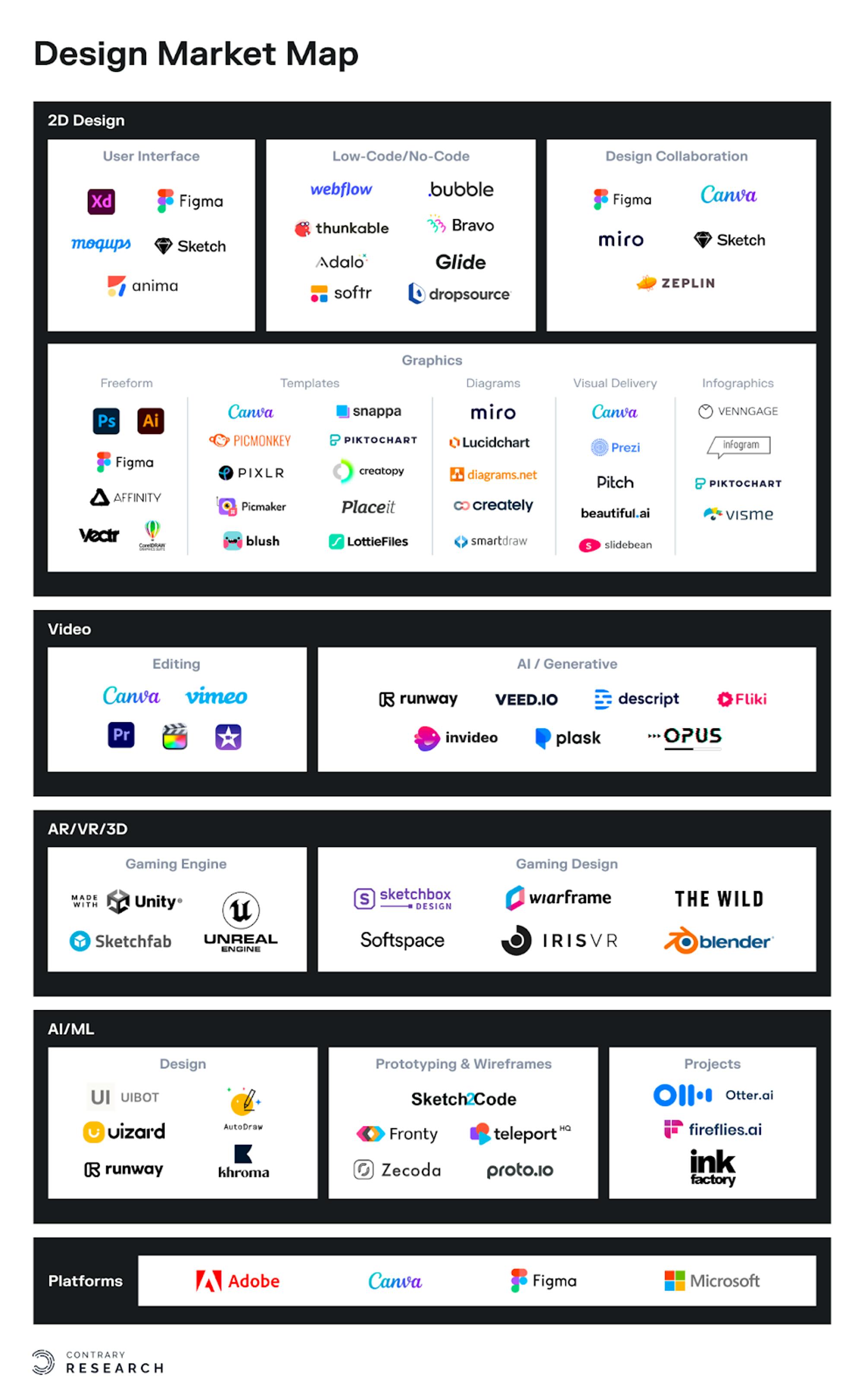 Meanwhile, Canva’s continued expansion of its platform has made it the most common tool for citizen designers. Canva’s success can be largely attributed to owning so much mindshare among would-be designers trying to get a specific job done. Microsoft’s partnership with OpenAI, their Designer platform, and their broad enterprise distribution will likely be a formidable threat to Canva as both companies battle it out to win over the long tail of citizen designers
