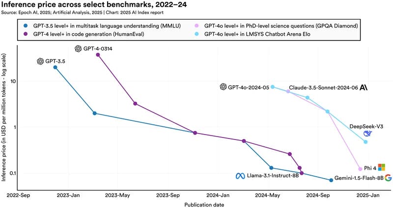 For example, an LLM chatbot query cost in tokens might be determined by the number of words in the user’s query, while a code editing query cost might be a function of the number of lines of code. Input tokens describe the length and complexity of the user’s query, and output tokens describe the complexity of the model’s response. Charts of inference costs falling are often shown in USD per million tokens, communicating how much it costs companies to run queries of equivalent complexity on improved models and hardware stacks.