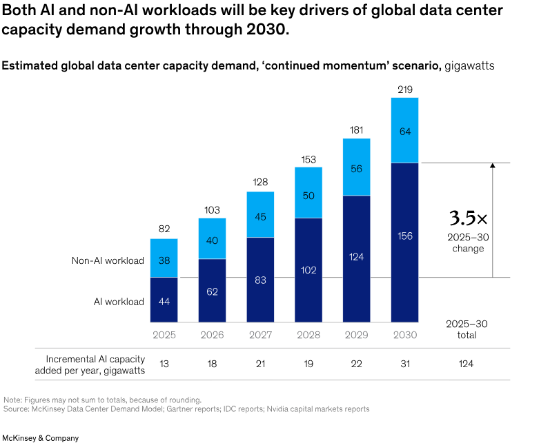 One McKinsey report from April 2025 predicts that 170 to 220 gigawatts will be required by AI data centers by 2030. The same report estimated that data centers would need to spend $6.7 trillion by 2030 to keep up with the demand for compute, including $5.2 trillion for AI compute alone.