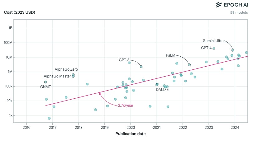 As new models with larger training bases are released, the cost to train those models has increased by orders of magnitude, even with the falling costs of inference.
