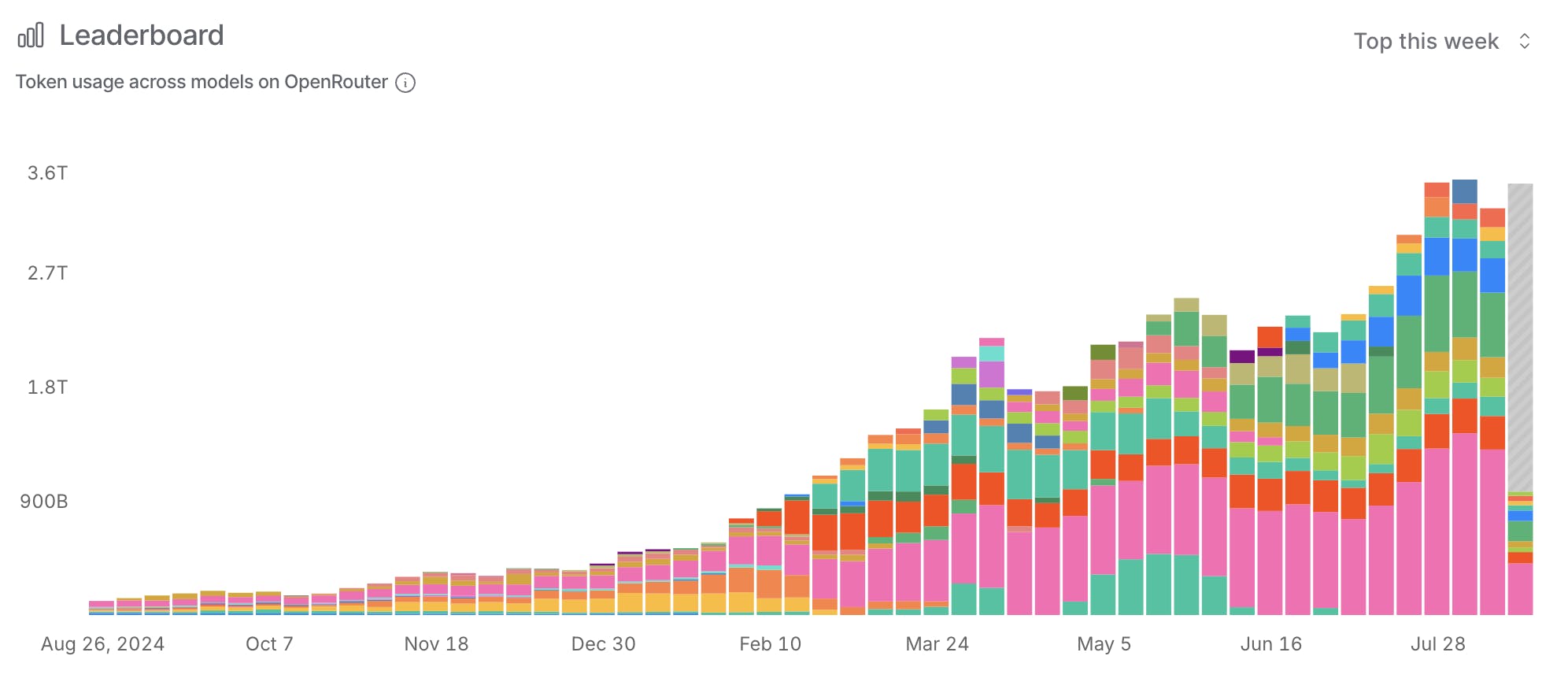 By design, these improved models are gaining traction among users more quickly than earlier models. According to OpenRouter, an LLM usage data collector, LLM usage alone has increased by 30x in the last year. However, each one of these queries may be orders of magnitude more expensive in number of tokens than past queries as AI applications become more complex. Meanwhile, Anthropic has reported that agentic AI models (which are not shown on the graph below) may cost 4x - 15x as much as LLM chatbots for queries of the same complexity.